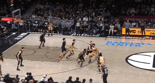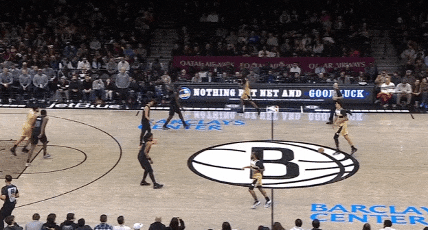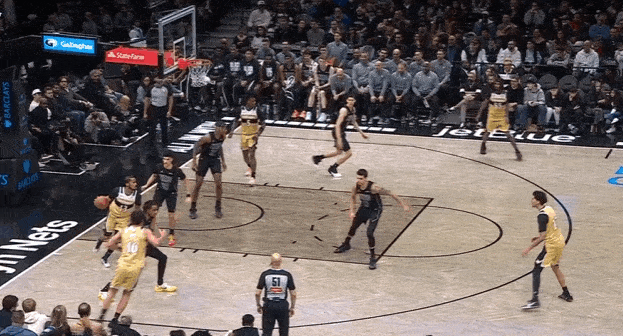 队友持球行进至低位转背身发牌,吉尔和莱利随即衔接“Flare Slip”配合,莱利上前接球后立即使用一二步急停拔起出手三分,以波特的招式顶着波特扑防干扰打进3+1。
