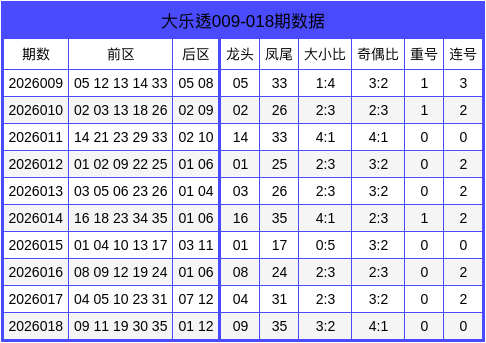 当期前区号码大小比为3:2,三区比为2:1:2,奇偶比为4:1,重号未开出,连号未开出。后区开出小大、奇偶组合的号码01、12。