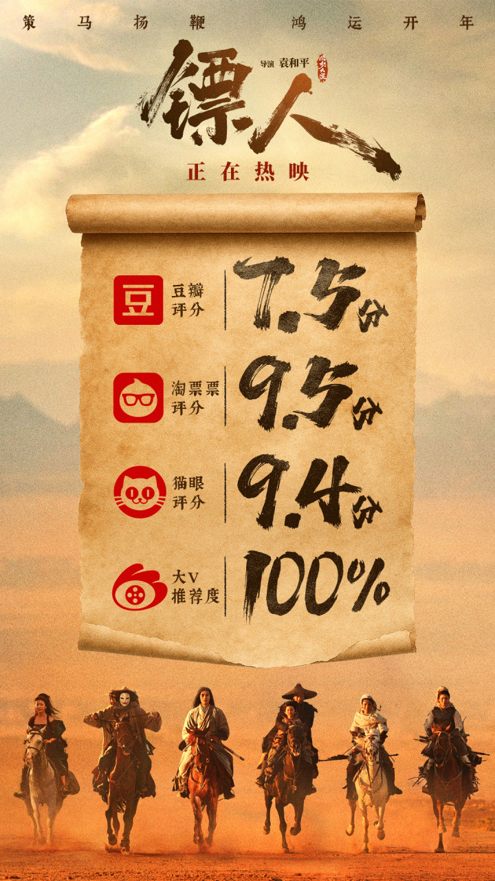 另一边,武侠迷们则在《镖人:风起大漠》中找到了久违的江湖气。八爷袁和平联手吴京、谢霆锋,将许先哲的现象级漫画搬上银幕,新疆戈壁的实景拍摄与密集的动作场面,为观众呈现了硬桥硬马、快意恩仇的东方美学 。该片在大年初三实现了单日票房的逆跌,成为档期内唯一排名上升的影片,7.5分的豆瓣评分也预示着其凭借口碑长线逆袭的潜力 。