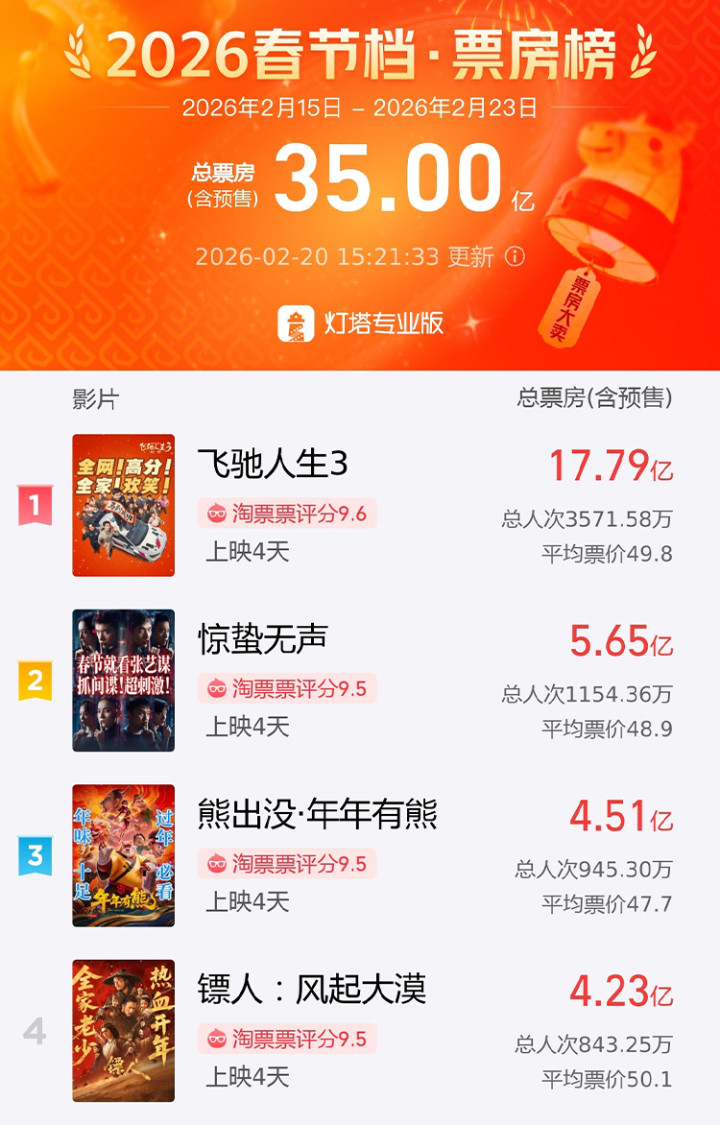 截至目前,2026年春节档总票房(含预售)已强势突破35亿元大关,带动年度总票房顺利跨过60亿元门槛 。回望档期前半程,市场呈现出一波三折的戏剧性张力。大年初一(2月17日)单日票房轰下12.78亿元,59.5万场的场次数更是刷新了中国影史单日场次纪录,为全年市场注入了强劲的开门红 。尽管次日数据有所回调,但初三的坚挺表现再度稳住了大盘信心,展现出春节档作为“超级档期”的韧性与潜力 。