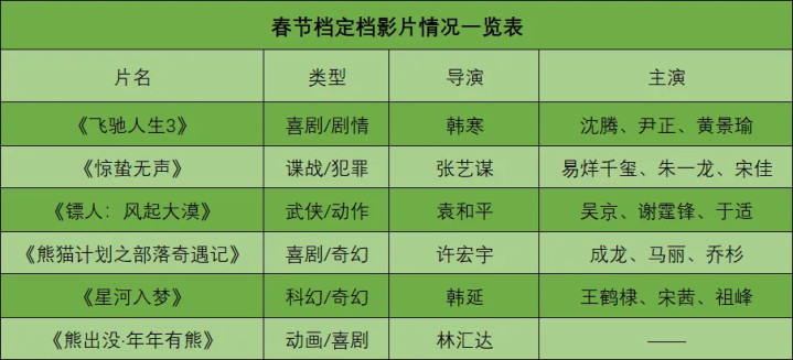 自1月28日《熊猫计划之部落奇遇记》(以下简称《熊猫计划2》)定档后,春节档已经汇集了6部电影。从数量上看,和往年持平;从类型上看,涵盖喜剧、武侠、奇幻、动画等多种类型,内容供给比较丰富。
